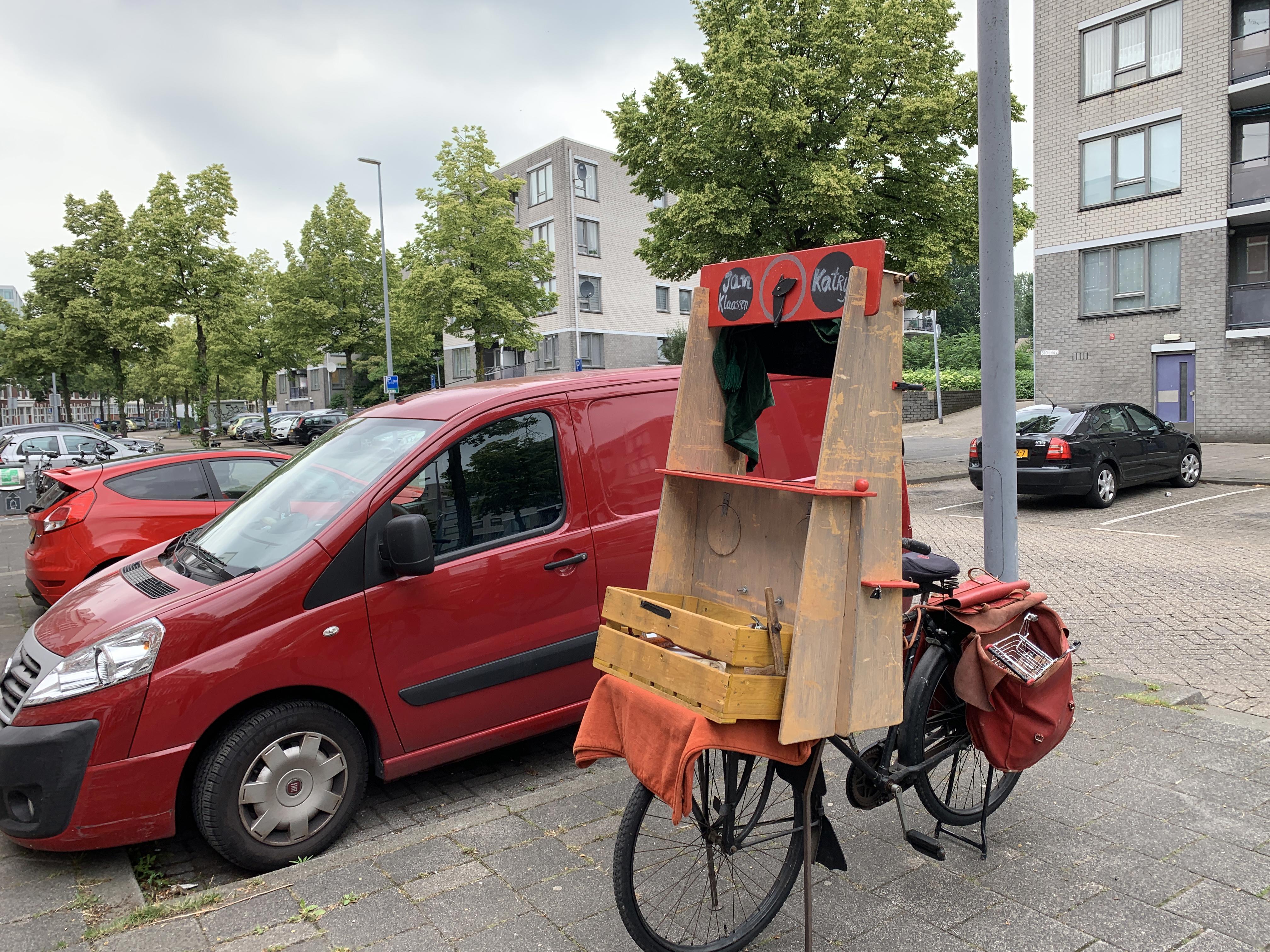 Voorstelling speelt zich af rondom traditionele post-/bakkers-/slagers-fiets. Er is live accordeon begeleiding. Door de fiets is de voorstelling mobiel en makkelijk te verplaatsen. Kan zowel binnen- als buiten. Desgewenst geluidsversterking. Ook kunnen bankjes voor de voorstelling meegenomen worden (tegen betaling). Zeer flexibel en in overleg programma aan te passen. Een voorstelling voor maximaal 3 groepen tegelijk, 1e voorstelling € 400, 2e voorstelling € 300, 3e voorstelling € 250,- ex 9 % BTW, ex € 0,50 per km reiskosten vanaf Uithoorn(Schiphol)