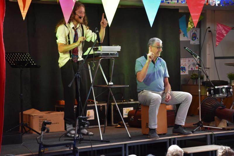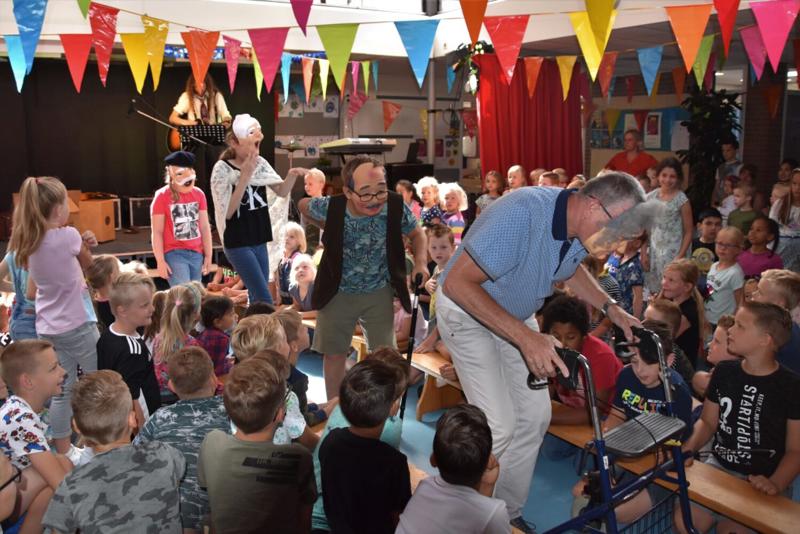Tijl maakte het afscheidsfeest van juf Thea tot een ware happening! Iedereen zong, danste en deed mee. Heel gezellig en voor juf Thea een geslaagd afscheid waar ze mooi op terug kan kijken!
