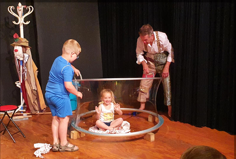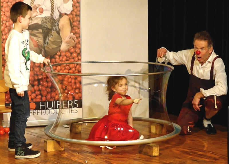 Natuurlijk mogen kinderen meehelpen: met muziek maken of in een levensgrote zeepbel zitten. Hoe kan het toch, zo heb je een bezemsteel en zo is het een levende pop die verliefd wordt op je moeder. O ja, accordeon speel je met het puntje van de tong.