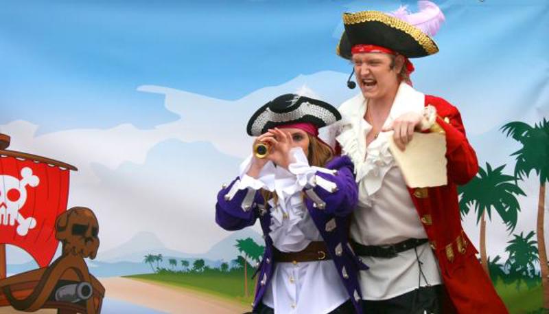 decor groot: piratenship, achtergronddoek 6x2,5 meter, palmbomen (ook aan te passen naar kleinere locaties)