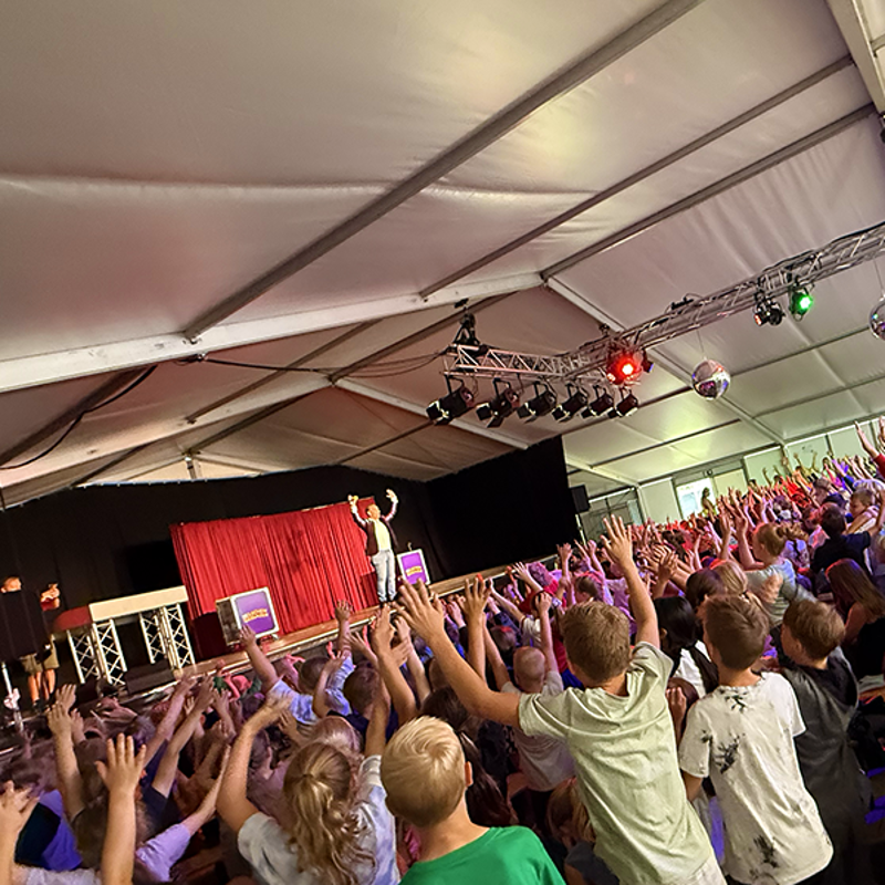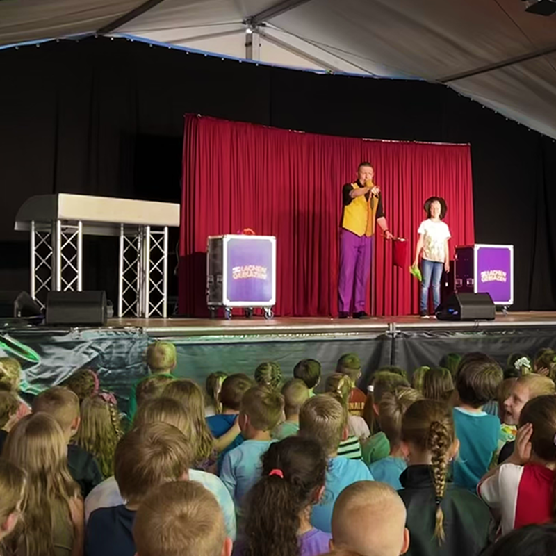 De Kids Party is voorzien van professioneel geluid en u kunt het geheel compleet maken met sfeervolle podiumverlichting en een mooi showdecor. Dit zorgt voor een magische ervaring, passend bij uw evenement.
