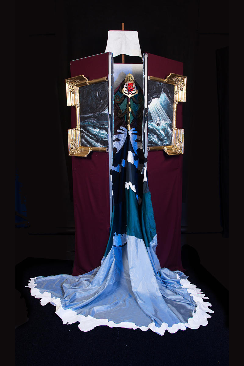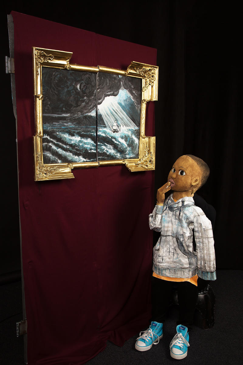 Veel variatie van groot tot klein en weer groot op schip op woeste baren wat bijna weer iets van de “ouderwets-klassieke” poppenkast laat zien.