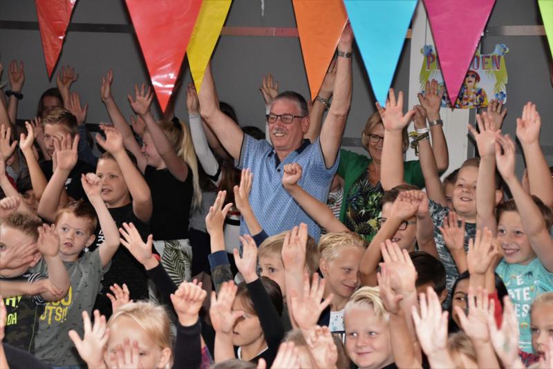 Tijl maakte het afscheidsfeest van juf Thea tot een ware happening! Iedereen zong, danste en deed mee. Heel gezellig en voor juf Thea een geslaagd afscheid waar ze mooi op terug kan kijken!